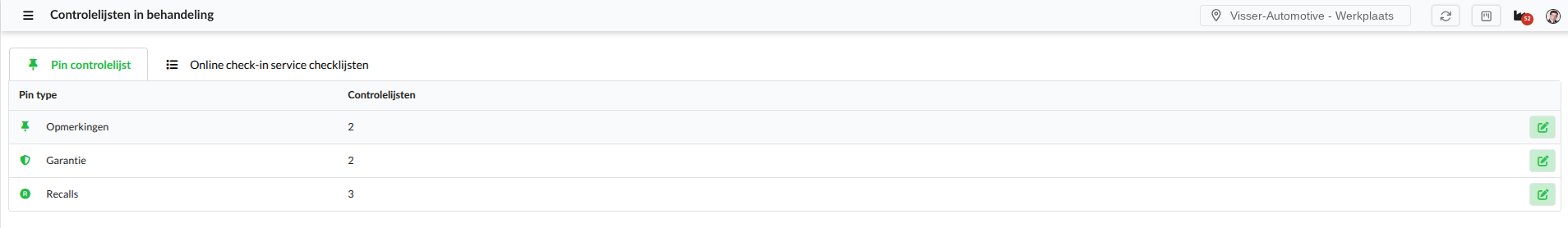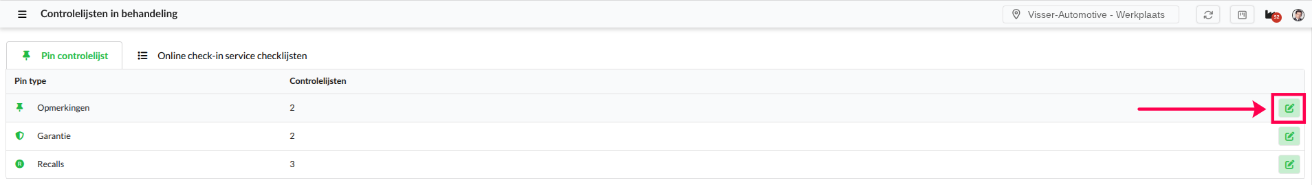 Op het eerste tablad Pin controlelijst kun je controlelijsten toevoegen aan de pin-types: Opmerkingen, Garantie en Recalls. Klik op het groene bewerk-icoon om controlelijsten toe te voegen aan een pin-type: