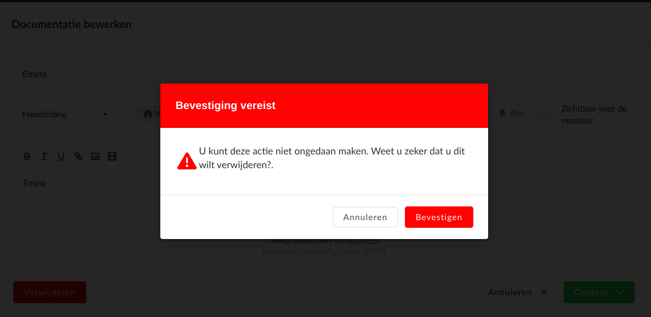 Dankzij deze functie kan een monteur bestanden toevoegen aan een WO als bijlage. Toegang De functie is bovenin de werkorder overzichtspagina te vinden door op het paperclip icoon te klikken. Bestand toevoegen Nadat je op de paperclip hebt geklikt zie ...