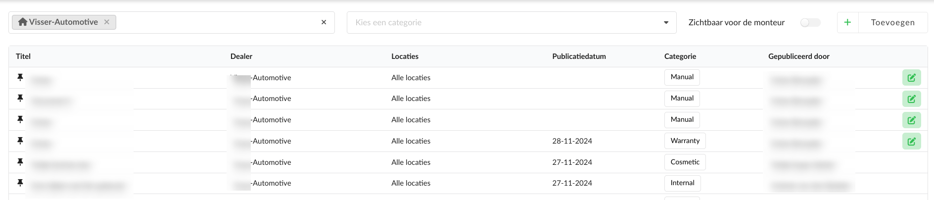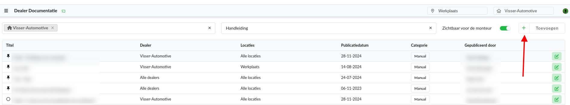 Met het Dealer Documentatie-dashboard kan het team eigen documenten uploaden en publiceren.