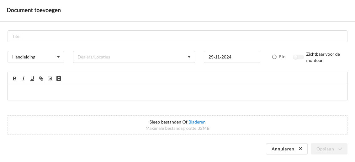 - Dealers/Locaties: De locatie(s) waar het document zichtbaar moet zijn (minimaal één locatie).