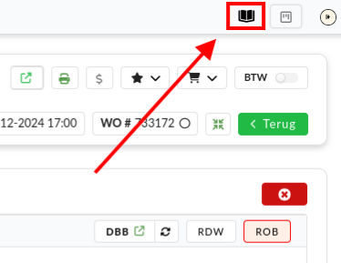 De functie is ook toegankelijk vanuit de wekorder detailpagina, klik rechtsbovenin op het boek-icoon. Daarna opent de Dealer Documentatie in een nieuw tabblad.