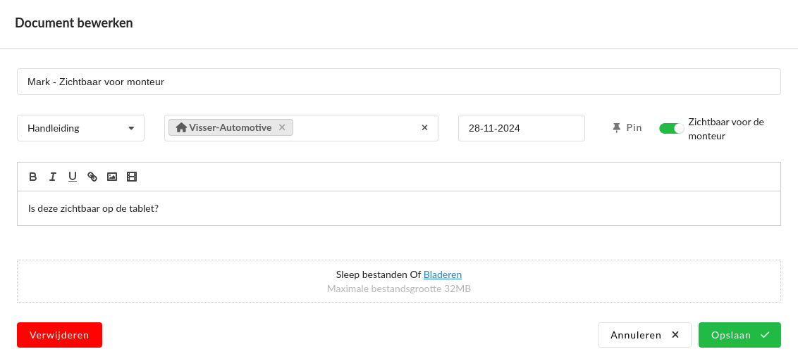 - Zichtbaar voor de monteur: Het document zichtbaar maken voor de monteur (staat standaard uit).