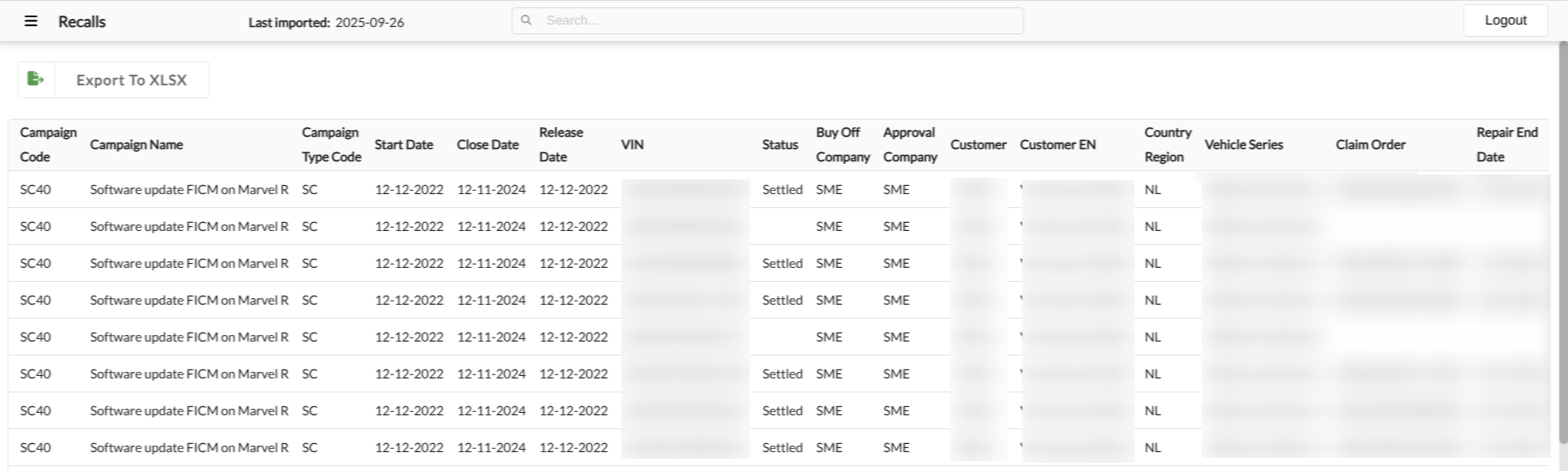 Recalls can be searched via the Seatch bar by campaign code, campaign name, campaign type code and VIN number.