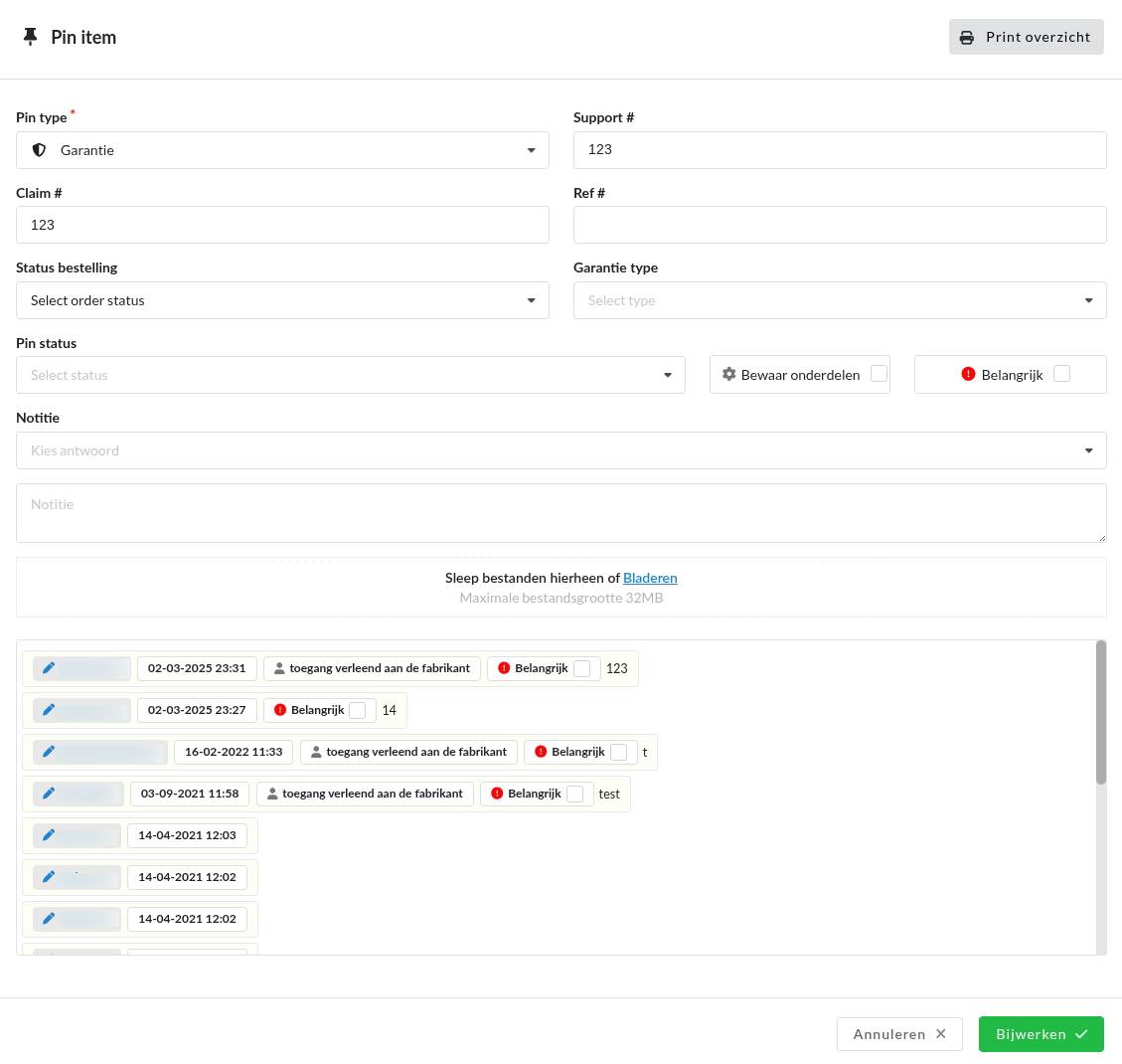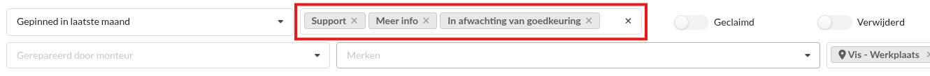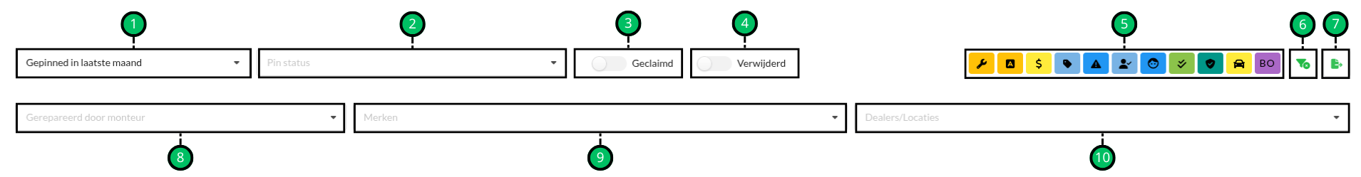 2 | Pin status | Filter op de pin status, zoals: Support, Meer info, Afgekeurd enz. Het is mogelijk om meerdere te selecteren. |