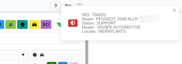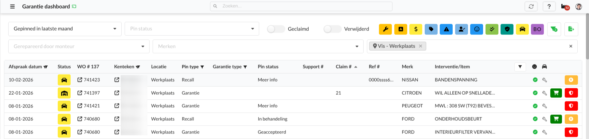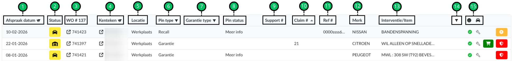| 4 | Kenteken | Het kentekennummer van deze werkorder. Klik op een kentekennummer om de WO in een nieuw tabblad te openen. Klik op het filter icoon om het vinnummer te laten zien. |