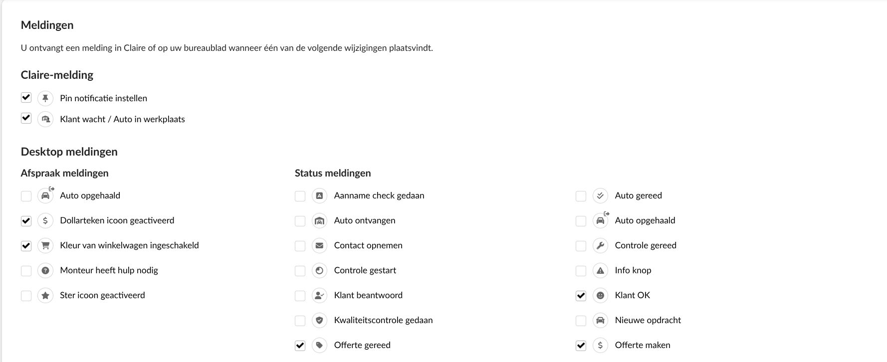 Als je een pop-upmelding wilt ontvangen voor werkorders van wachters die op 'Auto in werkplaats' staan, schakel deze instelling in.