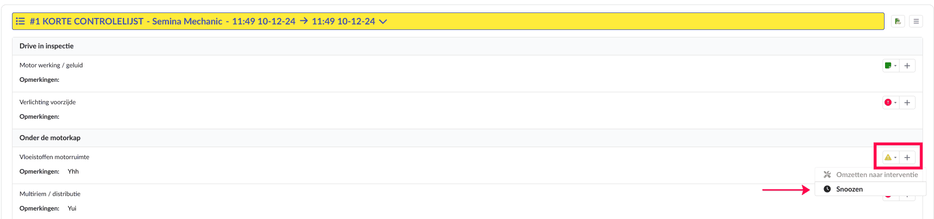 De receptionist activeert de snooze functie door rechts in de controlelijst op het plusje te klikken bij een item en te kiezen voor snoozen, zie hieronder.