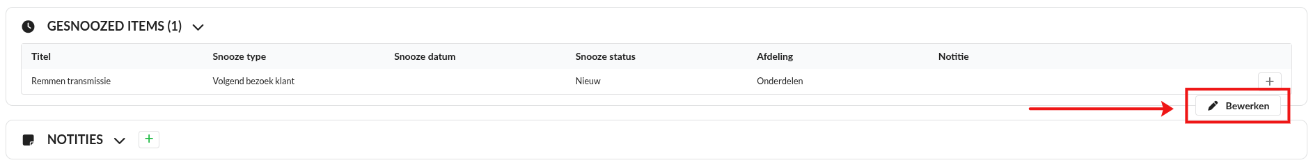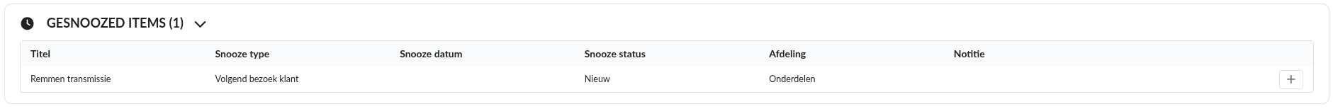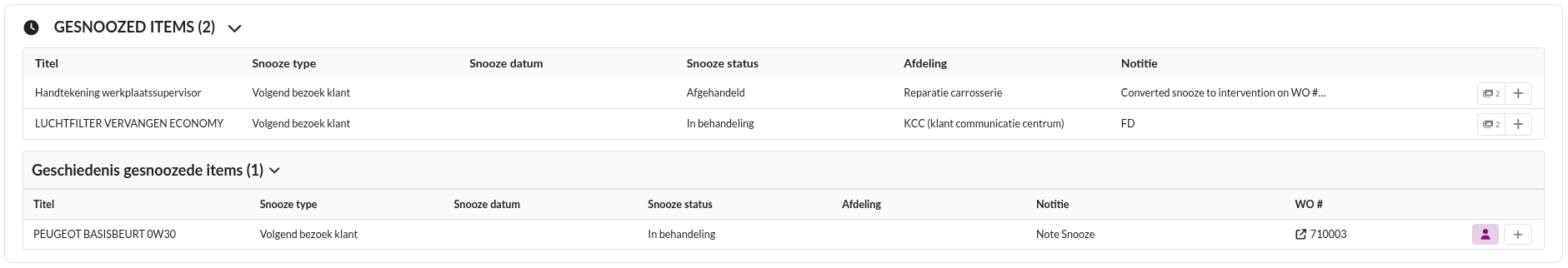Wanneer de auto later terugkomt voor een nieuwe afspraak zijn de openstaande gesnoozede items te zien in de Snoozed items tab. Er is een nieuw vak bijgekomen genaamd Geschiedenis gesnoozede items.