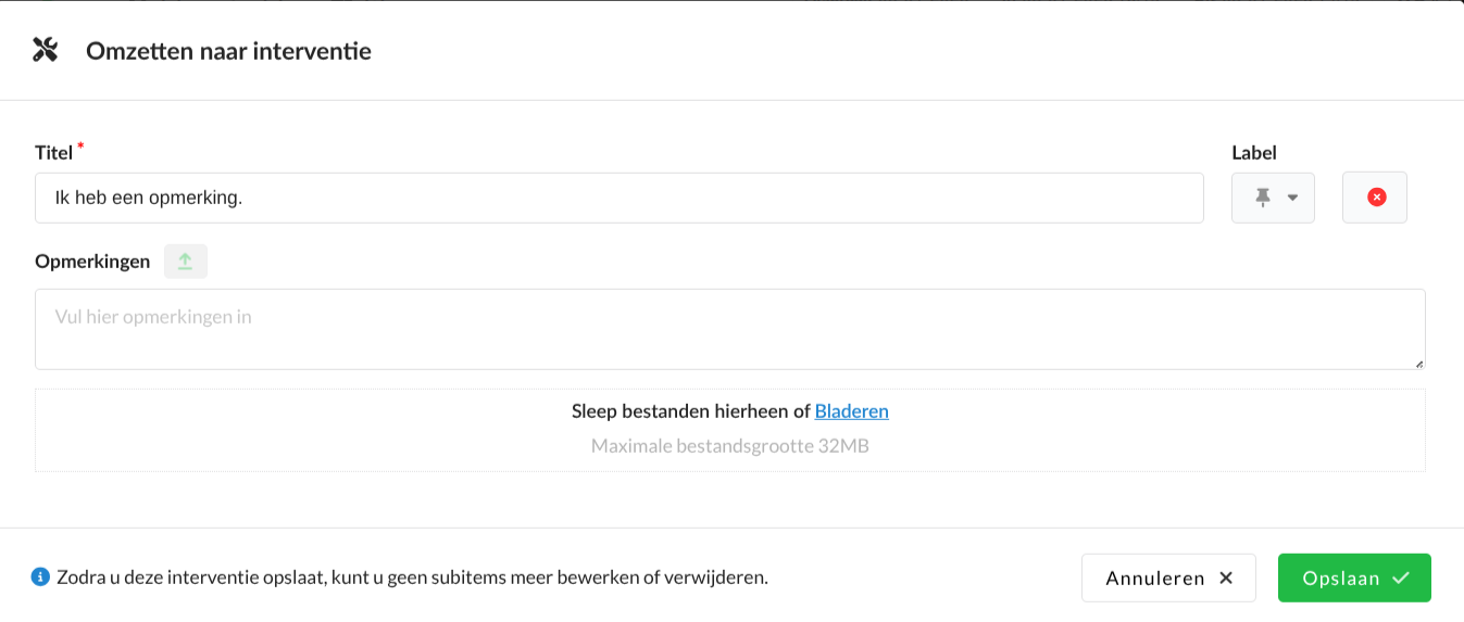 Indien je de Opmerking wilt gebruiken als interventie titel, klik dan op de groene pijl naast Opmerkingen:
