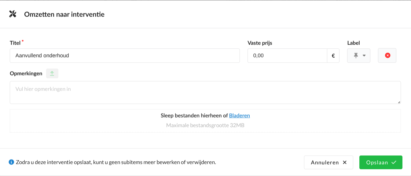 In V8 zijn interventies alleen bewerkbaar wanneer ze in de werkomschrijving staan. Alleen hier kun je informatie toevoegen, zoals een garantiepin of bijlages. Daarnaast zijn alleen interventies die in de werkomschrijving staan zichtbaar in de klantcommunicatie.