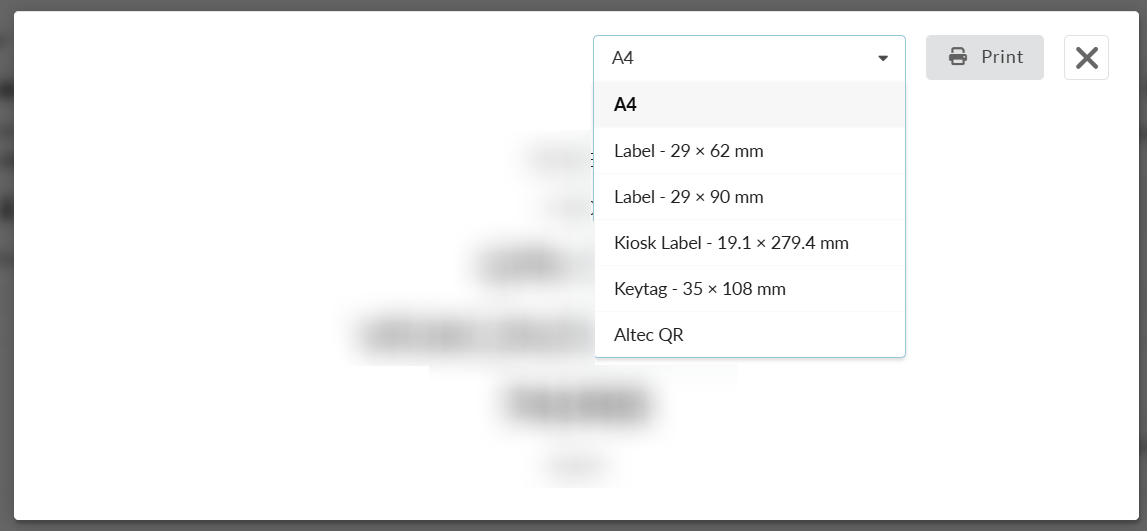 Zodra je op het icoontje klikt, opent een nieuw pop-up scherm met het sleutellabel. Hier kun je kiezen uit 6 formaten: