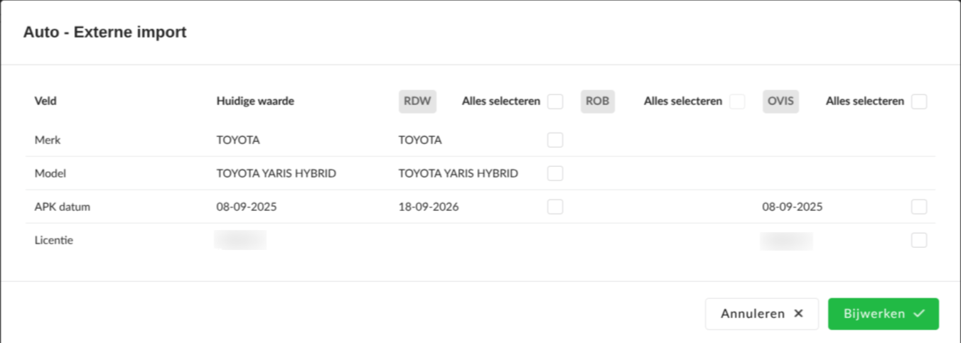 Als de auto-informatie ontbreekt (merk, model, APK-datum), kun je deze importeren vanuit RDW of ROB* door op de knop Externe data te klikken.