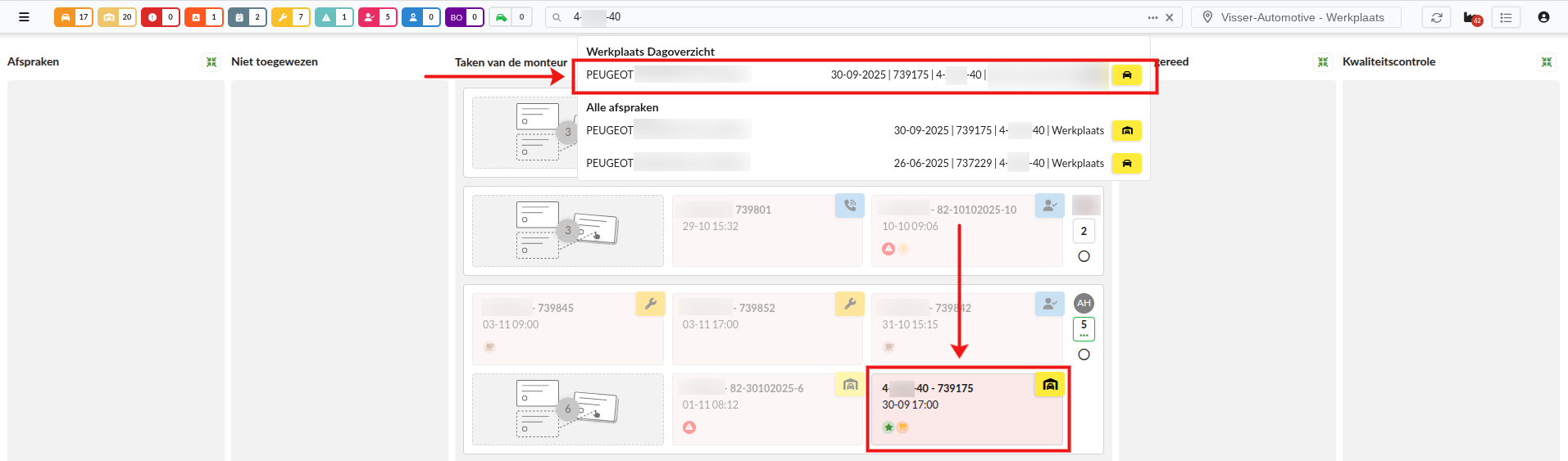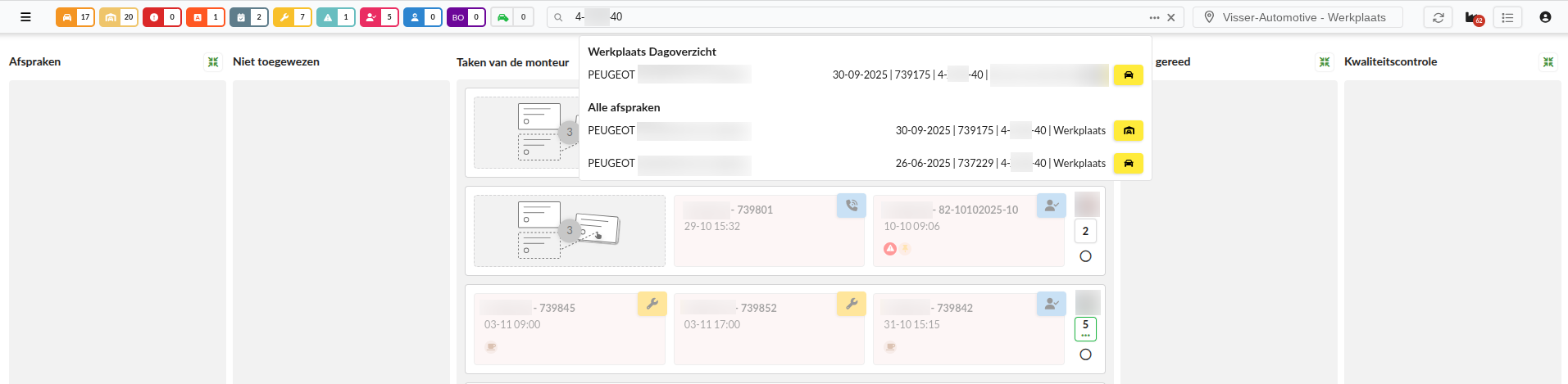 1 | Statusbalk | Een balk met statuspictogrammen die het aantal afspraken voor elke status weergeeft. Als je op een statuspictogram klikt, worden werkorders met deze status verborgen. | |