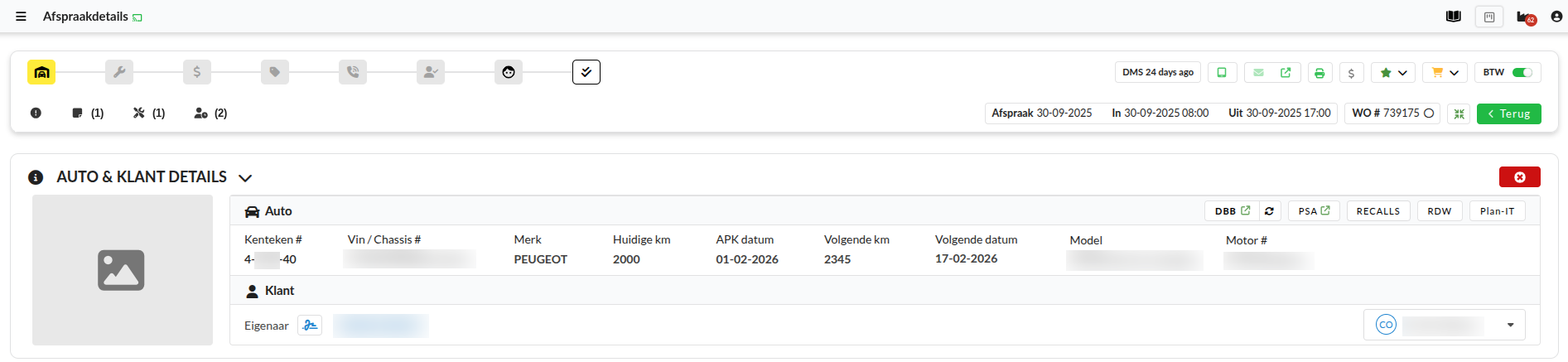 8 | Afspraken | De afspraak toont normaal gesproken het registratienummer, WO-nummer en een datum en tijd. Datum en tijd zijn gebaseerd op de eerst beschikbare gegevens van:
